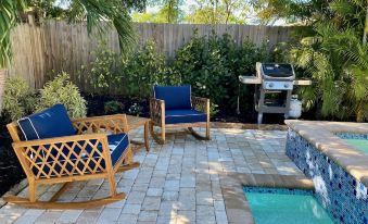 Continue through the patio sliders and you will find a large covered outdoor lanai dining area with a seating set and a stainless steel Weber grill. A perfect spot to dine. This area is part of the screened lanai pool area which offers full privacy with southern exposure for you and your guests An additional table and four lounge chairs complete the pool deck
