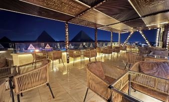 Hotel tem potencial, mas precisa de reforma e manutenção, pois realmente é de frente as pirâmides e a vista é sensacional. Mas nos deram um quarto realmente Podre, paredes caindo e descascando, com mofo, banheiro cheio de cabelos, piso quebrado, sem cuidado algum. Hotel precisa é de um bom gerente. Cafe da manha simples, mas bem feito, rapaz Mohamed, extremamente simpatico e util. Sem muita opcao de jantar no hotel, mas fomos no hotel ao lado Great Pirâmides, foi sensacional, mesma vista, mostra o cuidado e bem gerenciado, atmosfera otima e comida saborosa, recomendo ficar nesse hotel, quase mesmo valor.