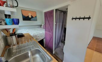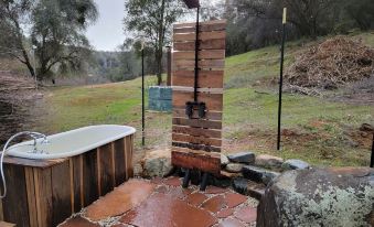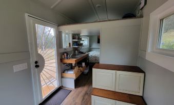 The tiny home provides everything one needs to by comfortable and happy. Its located at the bottom of the valley above the main meadow. You can hear the sound of the creek from camp all year long.