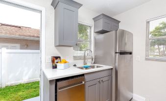 Welcome to our fully remodeled 1-bedroom, 1-bathroom home in New Port Richey! This cozy retreat features an open concept kitchen and living room, a King bed with fresh bedding, central AC, and a remodeled bathroom with a walk-in shower. Perfect for two adults with small kids, enjoy free WiFi, Netflix, and parking, plus a shared outdoor garden for morning coffee. Steps from downtown, shopping, restaurants, and Sims Park—just a 5-minute walk!