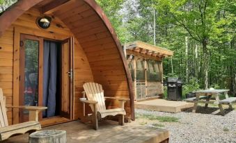 This cabin site is tucked into the forest at the base of the Deacon Escarpment with a view of the Bonnechere Valley Hills. It is a 10 min hike to the Escarpment Lookout, and roughly a 25 min hike to your canoe on a small lake. There is a picnic table, firepit, outdoor gazebo bar, seasonal outdoor shower and private outhouse. The cabin comes with a map of 30km of trails for you to hike or snowshoe. No neighbours within 500m in any direction. Possibility of occasional guest cars going past.