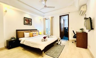 This Modern Three Bedroom Apartment just located next to famous M Block Market in Greater Kailash 2, South Delhi. It is a Private 3BHK Flat (2100 sq ft), Bedrooms with King Beds & attached Bathroom, Balcony, Living room with Couch & Dining plus Fully loaded Kitchen with Stovetop Gas, Refrigerator, Microwave, cookware, etc.