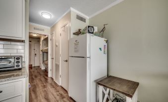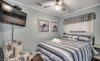 The serene bedroom features a queen bed and flat-screen TV, offering a peaceful retreat when it’s time to recharge. Got extra guests? The hallway bunk beds are a cozy and fun sleeping spot, especially for little beach adventurers.