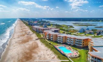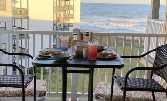 Ocean Front Luxury at an affordable price located in Building 3 of Topsail Dunes Villas which offers an elevator. Bring your bathing suit and get ready to make special memories that will last a lifetime. This unique Top Floor, End unit offers an oversized ocean front balcony giving you a birds eye view to the passing dolphin and crystal blue waters of the Atlantic Ocean. The private 8 x10 screened in porch provides the perfect spot to relax and witness the spectacular display of color from the sun setting over the intracoastal waterway. This unit is perfect for a couple or small family. Master Bedroom with King Size bed along with a standard size sleeper sofa and twin size sofa chair in the living room for the children to use.