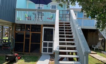 Quiet street 1 mile from north end of North Topsail, across street from the St. Regis. 1 block or less to public beach access and public pier/dock. Queen bed, spectrum internet and 15-channel cable package, wall-mounted TV that can rotate to watch from bed or sofa. New AC, LVP flooring and sofa in 2025. Kitchen has the essentials including coffee maker, toaster and stock pot for your shrimp boil. Outdoor space equal to three rooms -- front and back deck, choose sunshine or shade. Under the house is completely screened in with ceiling fan, couches for a nap, minifridge and shower with hot and cold water.