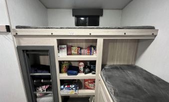 This spacious RV features two private bedrooms, offering cozy sleeping arrangements and a little personal space for everyone. The main bedroom has a comfy queen-sized bed with fresh linens and storage for your things. The second bedroom is perfect for kids or guests, with multiple bunks or convertible sleeping space depending on your needs. The bathroom is clean and convenient, with a full shower, sink, and flushing toilet—no roughing it here.