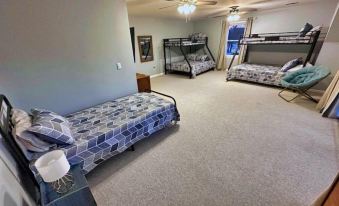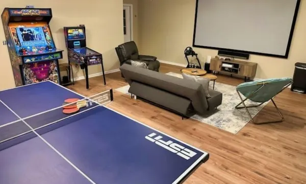 There's another twin bedroom connected to the amazing movie/game room. Here you'll find a 120" movie screen with high end laser projector and 5.1 surround sound. Connected to it is an Apple TV which can download every streaming service app you have, and an Xbox Series S with Xbox Game Pass subscription along with a dedicated steering wheel and pedal setup for race games like Forza Horizon. Theres an electric recliner and a couch which can be made into an additional bed when needed. There is a full size ping pong table along with two arcade machines. The first full size arcade was custom designed and contains thousands of retro arcade and console games. The other system is a virtual pinball arcade replicating hundreds of vintage pinball machines.