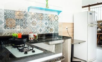 Kitchen: equipped with stove, refrigerator, blender, pots, dishes, cups, glasses, cutlery and other utensils for preparing meals.