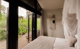 Stay overnight in a tiny house of 32m2, where function, design, and luxury have been taken into account, so that a tiny stay is also a comfortable stay. The master bedroom is the real eye-catcher, 3.5-meter-high windows give the feeling of sleeping in the forest, and the comfortable bed ensures a good night's sleep.