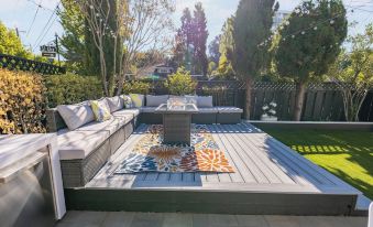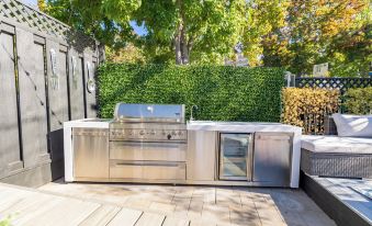 Step through a stunning architectural front gate into a hidden oasis in the heart of town This private yard is perfect for relaxing with a book or unwinding during your travels, featuring an outdoor grill, dining area, and firepit ideal for entertaining