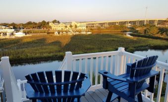 This designer-inspired custom luxury home has gorgeous sunset views of the Odell Williamson bridge, along with open marshes, wildlife, and grasses every day of the year. Bring your boat and take advantage of our deep water dock or simply use it for swimming, kayaking, crabbing, and fishing. A fun week of water sports awaits you. Soak up the sun with our poolside lounge chairs. It’s perfectly understandable if you decide not to walk to the beach because everything you need is all right here! Relax at the pool bar and watch your favorite football team on the outdoor 55 inch smart TV or find yourself preparing a gourmet meal in the well-appointed kitchen boasting granite counter tops, a spacious over sized island with seating, and GE slate appliances including your own free-standing ice maker. The elevator is available to take you to every level of the home. The open, reverse floor plan gives you expansive views from every room in the house.