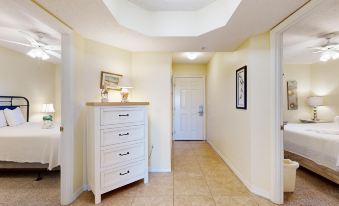 This Gulf-front condo is located on the second floor. The condo has porcelain tile in all rooms except the bedrooms, which have carpet. The kitchen is well-equipped with a microwave, dishwasher, stove, and refrigerator, along with all of the dishes, glassware, pots, pans, utensils, and small appliances needed to prepare and serve meals. The kitchen includes a bar area with three stools for additional seating. The dining room has a glass-topped table. The living/dining areas have two large windows and a sliding glass door to access the large balcony, with dramatic views of the Gulf and an 80-foot pool. The living room has a queen sofa bed, sofa, and easy chair, along with a 40-inch LCD HD TV and CD player. The bedrooms have TVs with CD players. The condo is equipped with high-speed WiFi and local telephone service. A washer/dryer is included.