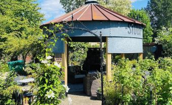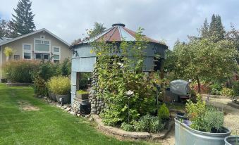 It’s the perfect location for travelers looking to experience the local vibe. Visitors can also enjoy our quaint neighborhood bakery right around the corner. The garden is magical and whimsical during the day or on a beautiful evening. There is a covered outdoor Grain bin with seating and fireplace.