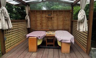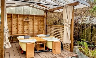 Nourish yourself in the year-round, open-air bathhouse featuring 2 spacious clawfoot tubs. Customize the water temperature to your liking. Full-length curtains offer adjustable privacy, while fairy lights create a magical ambiance. Situated under the towering trees, sheltered for relaxation out of the rain.