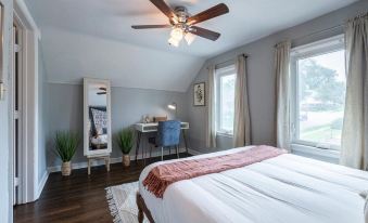 ⋗ Bedroom 1: Dedicated workspace and ceiling fan