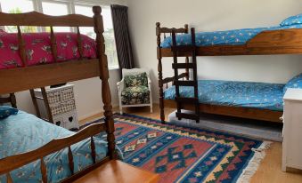 The two upstairs bedrooms have stunning views of the sea and dunes. Downstairs you will find the original 1960’s kitchen, a double bedroom, as well as open plan living and dining. There is also a small playroom and large chalkboard for the kids. This quirky bach was formerly a home, cafe, backpackers and windsurfing school and perfect for large groups and extended family holidays.