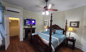 The 6 large bedrooms in the main house exude old-world elegance with high ceilings, crown molding, and wood floors. Each bedroom offers a memory foam mattress, 55” 4K Smart TV, individual mini-split A/C unit, and a cozy fireplace with faux log heaters, allowing you to control the perfect climate. The main house also includes multiple living areas: gather in the family room with its 65” 4K Roku TV, enjoy quiet moments in the historically styled living room, or work remotely in the office/morning room with two fully equipped workstations.