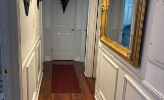 The hallway to the rooms provides with closet for towels and bathroom access near the two guest rooms and living room.