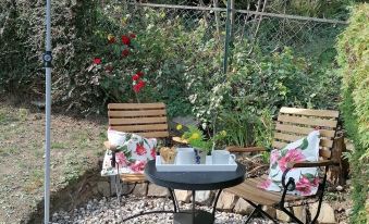 Zum Haus gehört auch ein kleiner Garten, der bei Sonnenschein zum Verweilen einlädt, und es geht gleich hinter dem Haus ein Weg zum Spazierengehen in den Berg.