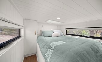 The tiny house is fully self-contained and includes a well stocked kitchen for all your cooking needs, including two-burner gas cooktop, electric oven, microwave, kettle, toaster, bakeware, utensils, fridge/freezer, cocktail accessories and Nespresso pod machine.
