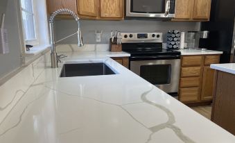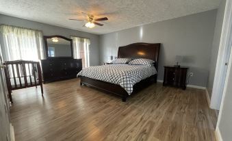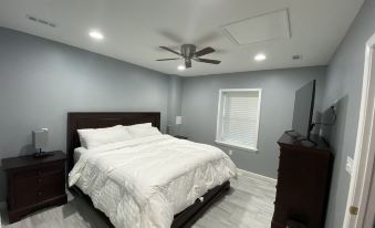 The space features four large bedrooms, with three king beds, two queen beds, and two additional queen air mattress, crib and couch to accommodate 14 guests. Four bathrooms, bathtub, jacuzzi, glass enclosed shower, free standing cast iron tub, a glass enclosed shower, and a standing shower. Kitchen is fully equipped with a full sized refrigerator, oven, stovetop, microwave, dishwasher, coffee maker, knives, silverware, utensils, plates, cup, bowl and glasses. Washer, Dryer, and Detergent available to guests for use. The space also features a comfortable, height adjustable desk, living room, dining room, sofa, and large TV’s in the living room, master bedroom, and upstairs' bedroom. Includes the entire first floor and second floor. The basement is fully equipped with a full second kitchen, utensils, dinnerware, full gourmet kitchen, coffee maker, refrigerator, stove, oven, dishwasher, microwave, recliner sofa, and large TV’s. With over 4,300 square footage on the first floor, second floor, and third floor, porch, deck, picnic area, it provides ample personal space for everyone!