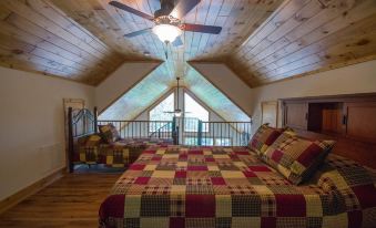 In terms of size, Tree Top can fit larger groups of 10 but would also work for a couple or small family. There are three (3) bedrooms and two (2) full bathrooms. The third bedroom is the large loft area you see in the living room pictures. There is a queen and two twin beds in that loft area. The main two bedrooms both have queen beds.