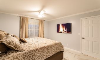 Unwind in luxury in our master bedroom, featuring a solid wood king-size bed with a brand-new Novaform 14-inch mattress, a 55' OLED smart TV, a spacious bathroom, and a walk-in closet. The master bedroom features a walk-in closet fully equipped with an iron, ironing board, and steamer for your convenience. Indulge in the ultimate comfort and relaxation during your stay.
