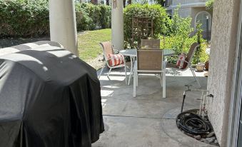 The master suite includes a wall mounted 50 inch TV, large double closet and double vanity and gorgeous walk in shower. The sliding glass door opens to the private back patio and laundry closet that features a full size washer and separate dryer. There is also a barbecue as well as glass top patio table with four chairs. Feels very private as if you are in your own backyard.