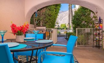 PRIVATE PATIO is great for alfresco dining with a table and 4 chairs. New BBQ, two anti gravity chairs for a quick nap, new ceiling fan, designer outdoor rug. French doors leading to living room. Stunning view from the patio of the San Jacinto mountains with the main fountain running in the back ground, truly that resort style living.