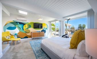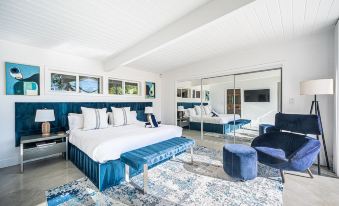 With direct pool views and access, this master suite at the southern end of the home features a large colorful mural, commissioned from respected local artist Lynda Keeler. You also get to experience a king bed with a luxuriously soft mattress and Brooklinen linens, a wall mounted TV and ample walk-in closet space. There’s also a separate vanity with a seat plus a large modern en-suite with a walk-in shower.