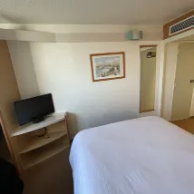 Ma le stanze sono un disastro: piccole, arredamento vecchio, moquette consumata ovunque, anche nei corridoi. Solo due prese in tutta la stanza, una occupata dalla TV e una libera — quindi se siete in due, già non basta per caricare i telefoni.