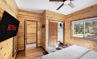 • Bedroom 1 (Upper Level): King bed with luxury linens, TV, and shared bathroom (shower with bathtub)