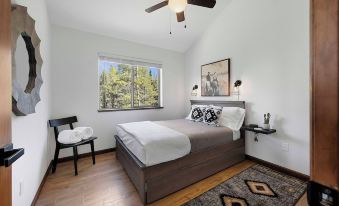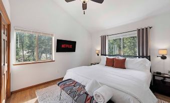 • Bedroom 3 (Main Floor): King bed with luxury linens, TV, bathroom across the hall (walk-in shower)