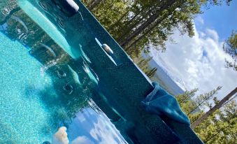 The large deck of the home offers comfortable seating, a propane fire pit, a propane BBQ grill and just a few steps down you can sink into the salt water hot tub for a quiet soak among the pines.