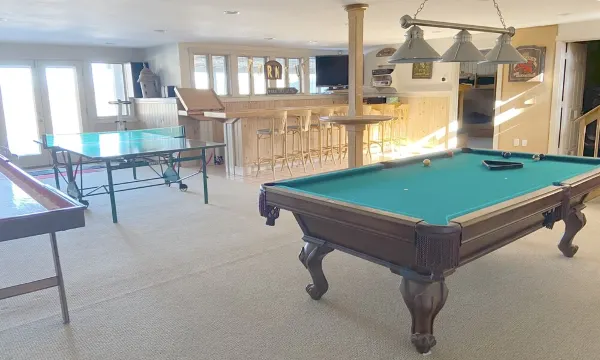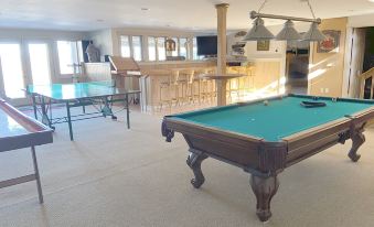 Great living and entertaining spaces are filled with natural light through windows and skylights. Enjoy gorgeous mountain views while having breakfast and coffee in the gourmet kitchen stocked with the chef's tableware. Read a book or engage in a conversation with friends and family in the sun room. Enjoy lunch with a glass of wine while taking in the views and sounds of nature on the deck or in the screened-in porch. Relax by a stone fireplace in the living room with a cathedral ceiling after a day of kayaking at Emerald lake, biking in Green Forest or hiking at Bromley, fishing at Gale Meadows pond or horse back riding, golfing or playing tennis or spending the day at the lake swimming and sun bathing. Art and food lovers will enjoy a day visiting a local farmers market, shopping in amazing Manchester outlets, eating out at a world-class restaurant, attending a concert at summer chamber music festival or catching a show at the summer theater festival. Animal lovers will love visiting a local farm and The Vermont Summer horse festival. Skiing, snowboarding, cross-country skiing or snowmobiling in winter is an easy option considering how close property is located to mountains: Stratton (20 min.), Bromley (8 min.), Magic Mountain (15 min), Okemo (34 min). After a day filled with so many experiences, guests can have fun in the game room which offers a pool table, ping-pong table, shuffleboard, a smart TV and a bar with a built in chess and checkers board.