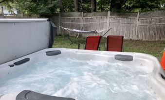 The cottage has its own private courtyard with new ( 2022) five person Bullfrog hot tub with all the bells and whistles - soak your cares away under the stars with views of trees and mountains beyond- totally fenced on each side so very private . The new tub has many jets with its own built in neck massager, lounge seat with foot massager , waterfall and led lighting .