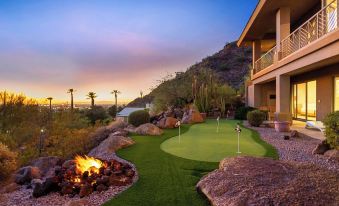 Step outside to your own private oasis: sip cocktails in the elevated spa as the sun dips behind the McDowell Mountains, take a refreshing dip in the pool with cascading waterfall and glowing fire features, or challenge your crew to a round of cornhole or putting green fun before dinner under the stars.