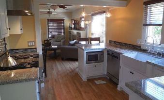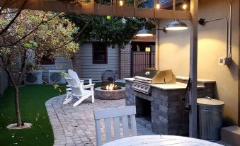 Off street, gated parking, a private back yard with a gazebo, barbeque grill, fire pit, indoor washer and dryer are just a few of the other amenities.About pets:No pets allowed.About checkOut:Check out before 11:00 AM.About children:Children allowed: ages 0-17.About customRules:We request that there are no shoes in the house. Please keep our new wood floors in great condition..About checkIn:Check in after 5:00 PM.About smoking:Smoking is not permitted.About minBookingAge:Minimum age to rent: 25.About events:No events allowed.