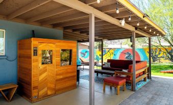 * Lush backyard oasis with a garden, fruit trees, patio seating, infared sauna, outdoor grilling and dining areas, mini putt golf & corn hole area, hammock and sun lounging areas, six seated fire pit area, hummingbird wall murals and cactus zen garden area.