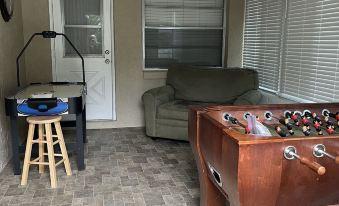 A cozy table for 2 by the coffee bar to check the weather and make plans for your day. Fully stocked kitchen has everything you need to prepare your meals. French doors off the kitchen leading to a game room. Air hockey, foosball table and board games with a loveseat to sit while waiting for your turn with the winner.
