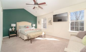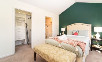 - Bedroom 1 has a luxury queen bed, pullout couch, private bathroom, and spacious closet