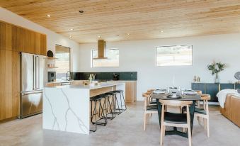 The home features 3 bedrooms, 3 bathrooms, open seating areas, dedicated desk workspaces, and private outdoor access. All rooms are outfitted with luxury linens and pillows, ample lighting, clothing storage, and luggage racks. All bathrooms include toiletries and high-quality towels.