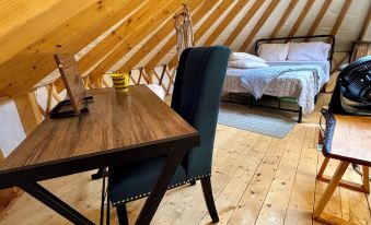 The Bee Hive is elevated on the mountain between 2 neighboring yurts. Yurts can be rented individually or in groups. They are separated enough for privacy if desired and close enough to walk between to visit with neighbors if booked in groups. Bee Hive boasts a spacious wrap around porch with a gorgeous view, a fully equipped kitchen for vacation meals, a huge soaking bath tub, a large loft, gas fireplace, and entertainment. The porch is enclosed to be dog and kid-friendly, and the driveway is accessible for sedans, SUVs, and motorcycles. The Bee Hive is great space to check in and stay put to unwind OR to rest your head in between outdoor adventures and small town exploring.