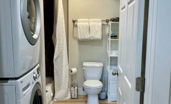 A full bathroom with a shower/tub combo. Fresh towels, toiletries, and a hairdryer are provided. Full size washer and dryer for your convenience.