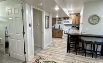 Fully equipped kitchen with needed appliances including a stove, refrigerator, microwave, instant pot, pebble ice machine, and drip coffee maker. Great for preparing meals to enjoy together. There is plenty of counter height seating available. Highchair is available if requested.