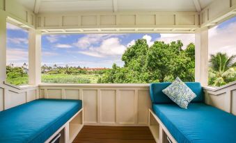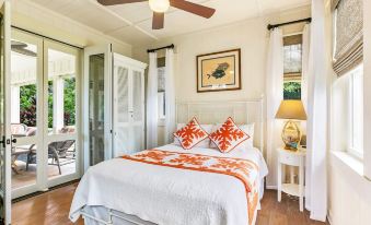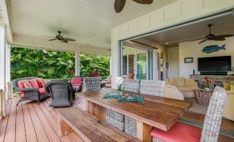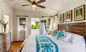 This custom designed Hawaiian plantation style cottage is located just steps from Poipu Beach Park and Brennecke’s beach on a quiet dead end street. It is the perfect vacation retreat. Hale Honu was just completed in September of 2014 and was designed to fit in with it’s historic neighborhood and the ancient Hawaiian Village that borders the backyard. Its location give a secluded feeling while being close to beautiful Poipu Beach. The cottage's plantation style is the perfect mix of old Hawaii while offering every modern luxury. Outside is a barbeque grilling area and a beautiful double garden shower accessible from either the guest bath or from outdoors. The open floor plan has a living room that opens up to the oversized covered lanai through expansive retractable glass doors. This allows the indoor and outdoor space to truly become one. Enjoy spending time on the spacious covered lanai, eating at the large dining table, relaxing in the conversation area or just lounging on the two chaises to watch the beautiful Kauai sunset. Ceiling fans keep the living areas breezy and cool. The kitchen is fully equipped with a gas range, full size refrigerator, whisper quiet dishwasher, as well as, granite counters, open shelving, and is fully stocked for all cooking and baking needs. The entertainment system includes a wide screen TV with surround sound, apple TV, blue ray DVD , as well as speakers through out the living room and the lanai Wi-Fi is included throughout the house and lanai as well as TVs in both of the bedrooms. Upstairs the bedroom has a California King bed and a private bath with claw foot tub/shower along with a window AC unit. There is also a screened in lanai/sleeping porch that overlooks the Ancient Hawaiian Village which is perfect for an afternoon nap or early morning coffee. The downstairs bedroom also has a window AC unit and a Queen Bed with adjoining bathroom which has a glass enclosed shower and access to the outdoor double garden shower.