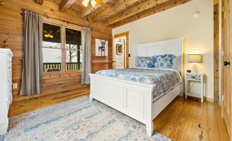From the main level, two entry points lead to a large wrap-around deck that is perfect for soaking up the fresh mountain air and enjoying all that nature has to offer. The kitchen is also located on the home's first level, featuring designer elements and opening up to the dining room, where you’ll enjoy more of the home's modern and rustic charm. You’ll find a classic wood-burning stove between the kitchen and living room to elegantly warm the home and your spirits during the crisp and cool winter months. Also, on the first level is a bedroom and bathroom outfitted with a queen bed and stylish white decor. This bathroom is accessible from the kitchen as well.