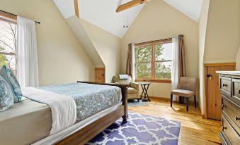 As you ascend the staircase to the home's upper level, you will notice the sleek metal balusters that line the staircase and the loft area. This design element mingles perfectly with the home's chimney and modern yet rustic feel. The mid-century style furniture and the view from the window above the desk are sure to invoke inspiration and a sense of well-being even in those who wish they could have left their work behind. There is a futon for relaxing or visiting with others during your work. There is limited use of WiFi available - WiFi is not appropriate for streaming or downloading large files, but rather for checking emails and other necessities. This level also features a lovely master bedroom that is bathed in the morning sunshine! This room can comfortably sleep one or two people, featuring a queen bed, a walk-in closet, and a single-person jetted tub.
