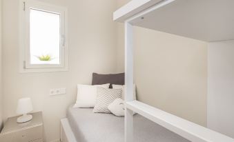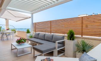 Port d'Alcudia: Very modern, comfortable apartment block "Attic Sea Views". In the centre of Port d'Alcudia, in a central, sunny position, 3 km from the edge of the forest, 50 m from the sea, from the beach, road to cross. Private: terrace, garden furniture. In the house: internet access, WiFi, lift, central heating system, air conditioning, washing machine. Public parking on the road. Shop 10 m, supermarket 70 m, restaurant 10 m, bar 5 m, bakery 150 m, pedestrian zone 50 m, bicycle rental 200 m, pub garden 5 m, 1 minute walk to the centre, bus stop 250 m, sandy beach 50 m, rocky beach 2 km. Sports harbour, marina 150 m, golf course (18 hole) 4 km. Nearby attractions: Parque Acuático 2 km. Please note: suitable for seniors. Object suitable for 2 adults. The owner does not accept any youth groups. Neighbourhood highly sensitive to noise. Quietness and good behaviour expected. "Attic Sea Views", 2-room apartment 90 m2 on 5th floor. Object suitable for 2 adults. Bright, fully renovated in 2021, very practical and modern furnishings: open living/dining room with panoramic window with dining table, satellite TV, digital TV, international TV channels, flat screen, air conditioning and forced-air heating. Exit to the terrace. 1 double bedroom with sliding door, panoramic window with 1 double bed (160 cm, length 200 cm), air conditioning and forced-air heating. Exit to the terrace. Open kitchen (oven, dishwasher, 3 induction hot plates, microwave, electric coffee machine) with air conditioning and forced-air heating. Exit to the terrace. Shower/WC. Large terrace. Terrace furniture. Panoramic view of the sea, the resort and the bay. Facilities: washing machine, iron, hair dryer. Internet (WiFi, free). Please note: non-smoking house. ETVPL/16015 // Reg. Nr.: ESFCTU0000070430003050990000000000000000ETVPL/160155