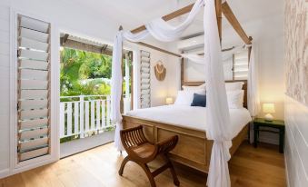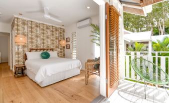 Upstairs, the Master bedroom has a queen size bed, quality built in wardrobes with french doors opening to a large, private balcony over looking the pool. Timber louvres, block out blinds, fan and air-conditioning; Enjoy the afternoons lying in the hammock on the balcony, reading your book. An ensuite bathroom is attached to the Master bedroom.